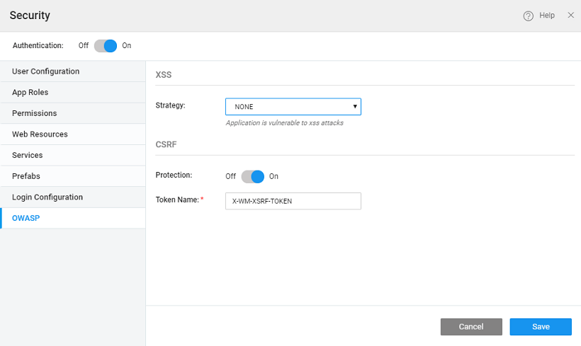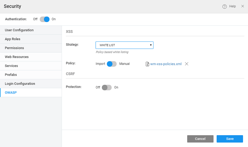 In WaveMaker Security dialog provides three strategies to handle XSS: