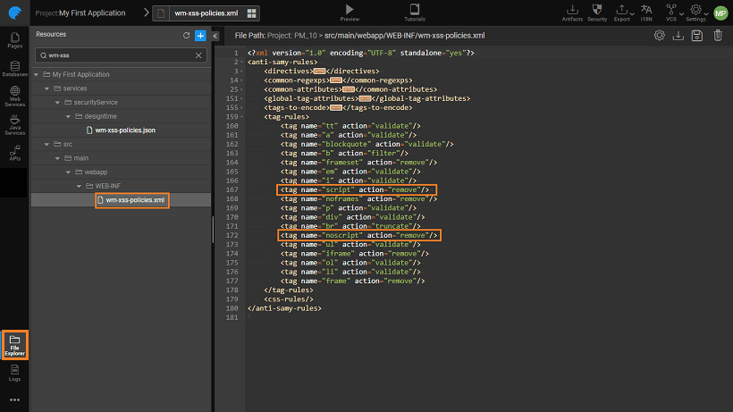 • Policy file: this will implement XSS protection based on the rules defined in /src/main/webapp/WEB-INF/wm-xss-policies.xml. The default policy file is wm-xss-policies.xml. According to this default policy file, script tags will be removed. However, you can upload your own policy file which will be uploaded to WEB-INF folder. Clicking on to the file name will open it in the editor. Go through the document for more descriptions on AntiSamy rules.