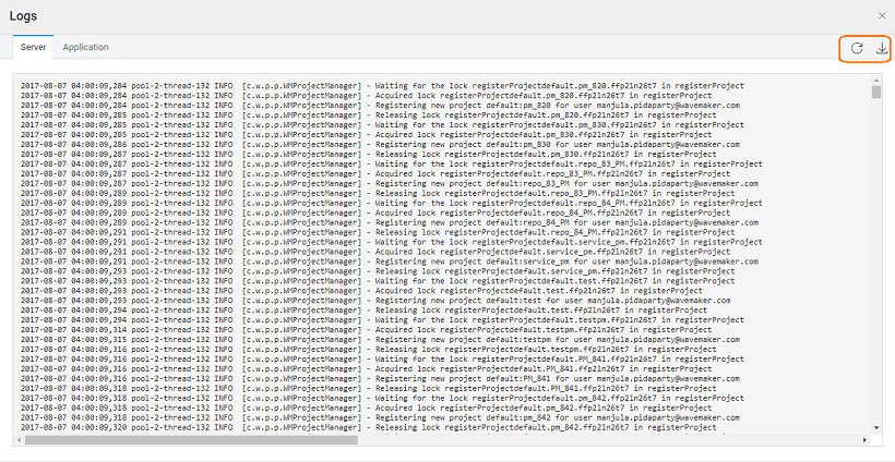 Server logs consist WaveMaker designer backend logs while developing the app. For example: On importing/updating database, sometimes a message saying error while updating/importing database please see server logs is displayed. In such cases, Server logs contain stack trace of error, along with the cause.