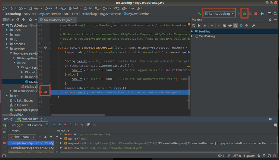 To debug any DB/Java service used in the app you need enable debug point in service and run it.