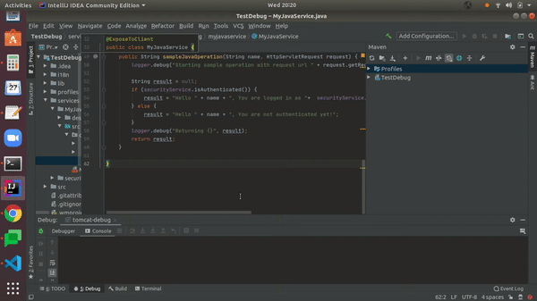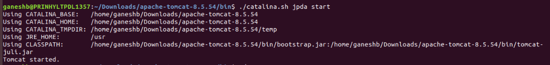 Now change directory to the Tomcat bin folder from terminal and type the below command (catalina.sh for Mac/Linux or catalina.bat for Windows) to Start Tomcat in debug mode: