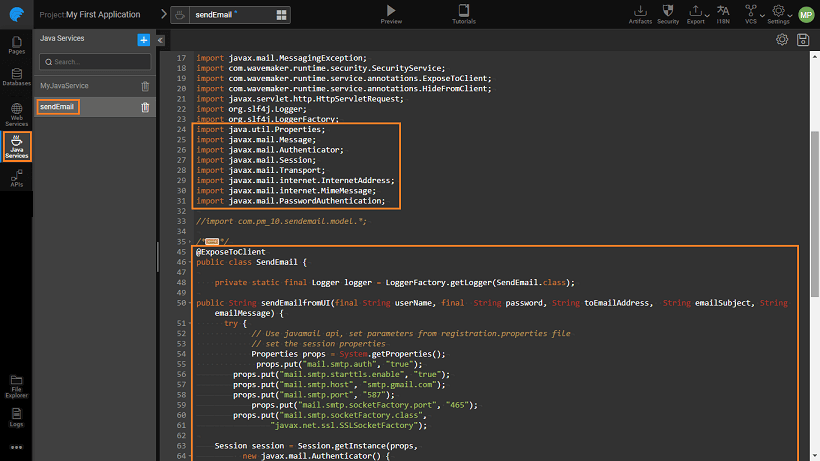 1. Add the import statements for the required classes in your Java Service file. In this example, we have used the mail.jar, the package details of which can be found at https://javamail.java.net/nonav/docs/api/. To use this jar file to send emails we will be using the following code in the Java Service file after adding the import statements for the required class files: