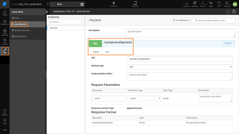 REST APIs are generated for the user defined Java Service Classes which can be viewed from the API Designer.