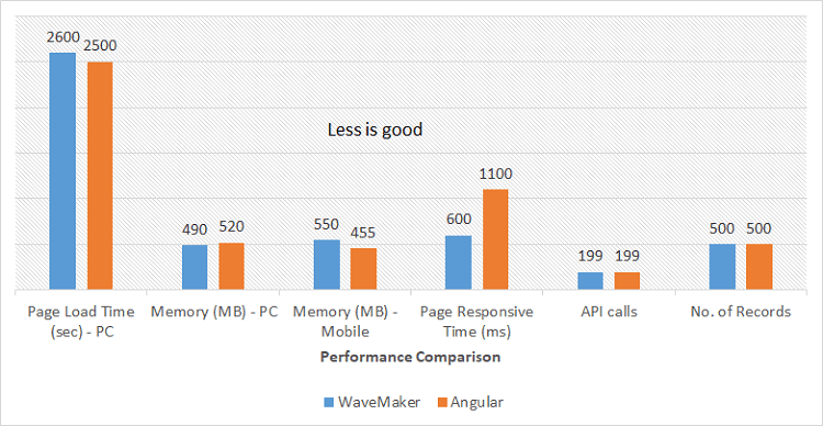 The following chart depicts performance comparison of an app built following the RAD approach using WaveMaker and a traditionally built app using AngularJS framework. The functionality of the app is designed to load several database records from a backend service, exposed as REST API to the UI layer, where the UI layer renders these records using widgets such as list, image, label, panel etc.
