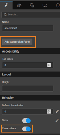 NameThe name is a unique identifier for the accordion pane. Special characters and spaces are not allowed in widget name.