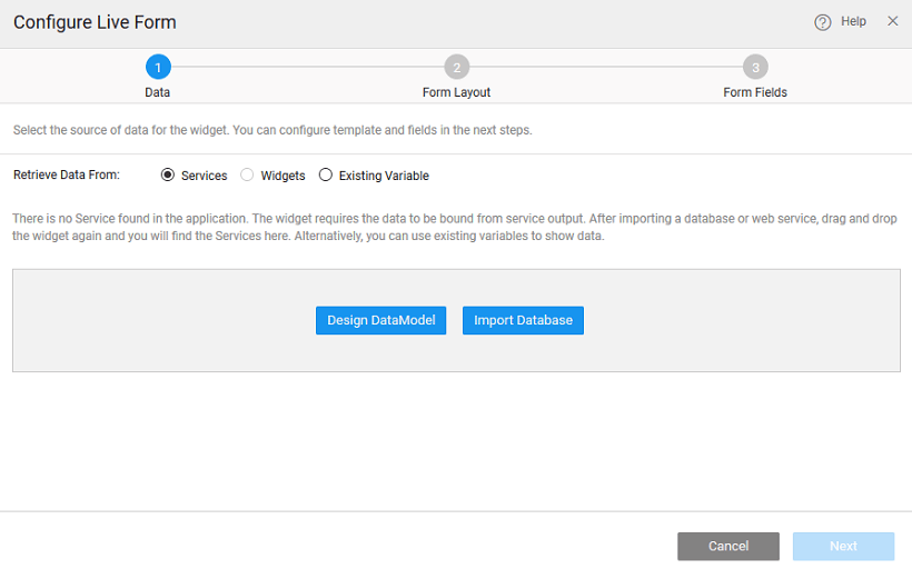 There can be different scenarios to deal with when configuring your Live Form Widget with a data source. The data source can be in the form of database CRUD variables or from an another widget, usually Data Table, on the page.