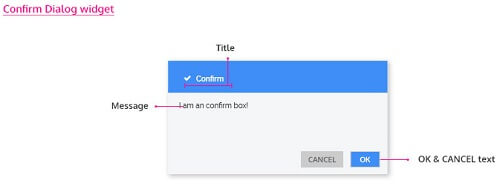 Confirm Dialog is used to get confirmation from the user. In addition to the properties mentioned for Alert Dialog, it has an additional Cancel button. The most common usage is to confirm a delete action.