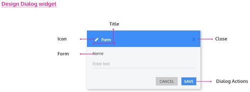 Design Dialog gives a Form for obtaining additional information from the user, like the name. It is a composite widget with Labels and Text widgets. It comes with two buttons Cancel and Save.