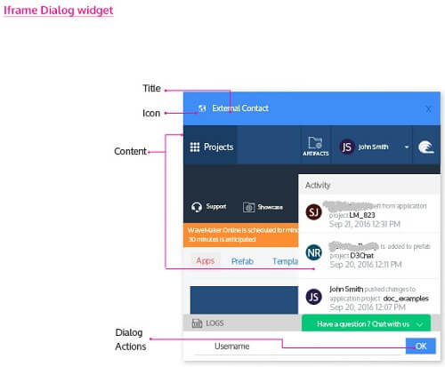 WaveMaker provides the facility to add pop-up windows to your project through the Dialog widgets. Pop-up windows are a way to give additional information to users without cluttering your project space. This can be for alerts, getting additional information like user name, or for login purposes. There are six types of Dialog widgets provided by WaveMaker.