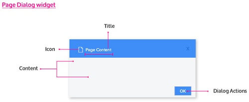 Page Dialog is a popup window that displays page content and can be dismissed by the user. The content property of this widget can be set to the desired partial page content.