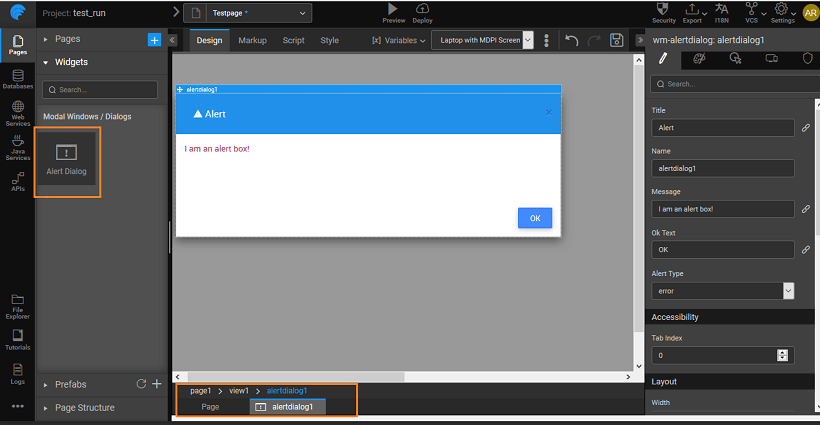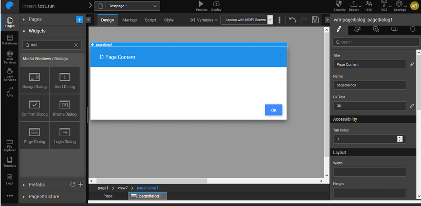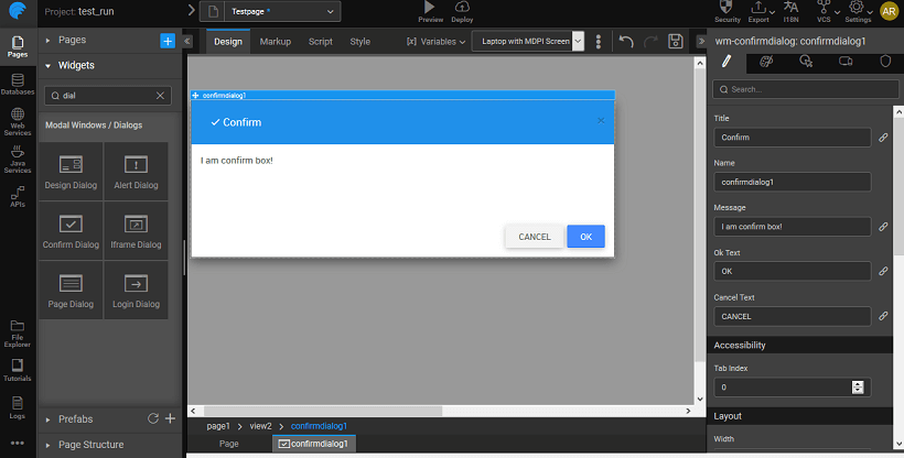 Dragging and dropping a dialog creates a view containing the dialog. The view can be selected from the Page Structure or from the tabs given at the bottom. The display of the dialog box at runtime is usually associated with the onClick event of a Button widget. You can also trigger the dialog by calling methods from JavaScript.