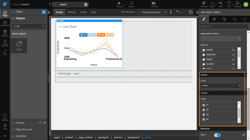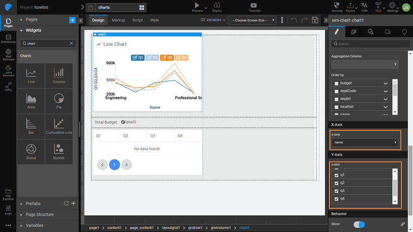 Drag and drop a Line chart onto the first Grid row. Bind the chart widget to the Department dataset, and set x-axis to deptCode and y-axis to Q1, Q2, Q3, and Q4