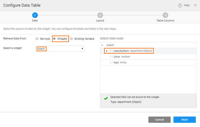- Drag and drop a Data Table onto the third row of the Grid. Set the data source of the Data Table to the selected item of the chart widget. Choose the other settings as per your requirements. We have chosen a Read-only table and selected to display department id, name, budget, code, and location.