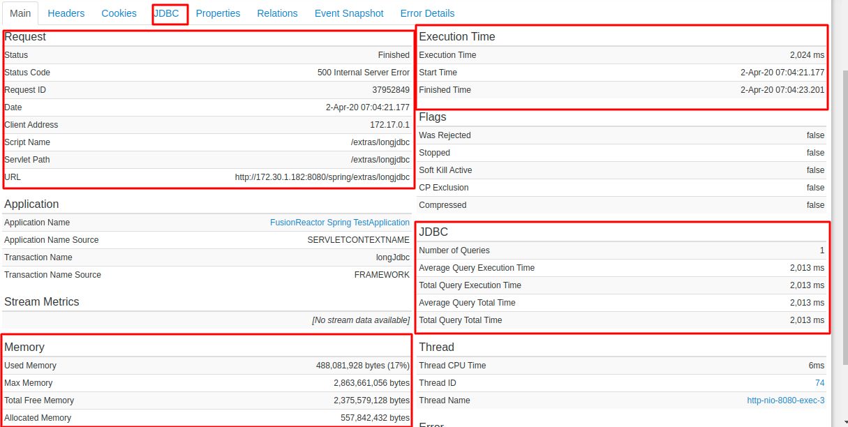 2. You can view details of the running transaction request with data related to JDBC Query analysis and Profiler for method execution times and more sections, which help you identify the root cause of the slowness.