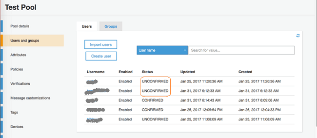 1. After creating the account, Login page shows up. Verification of the user should be done by going to to the Amazon Cognito Create User Pool page and click on Users and Groups in the Left Navigation Pane. This will show you the all the Users added to the user pool.