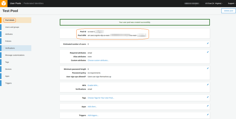 3. Note down the generated pool id and Pool ARN values