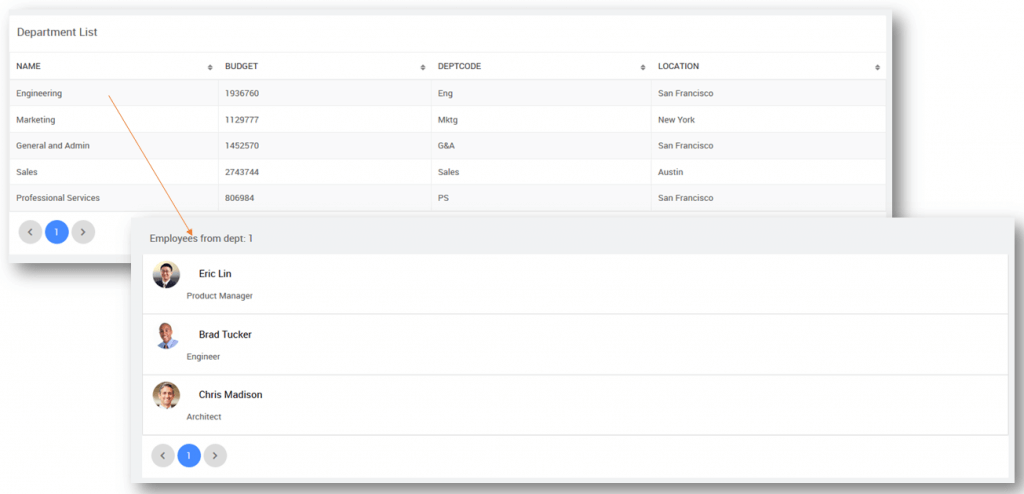 3. Click event of the Department Data Table will trigger a call to the Employee page passing the deptid, which will be used to filter the employee details in the Employee page.
