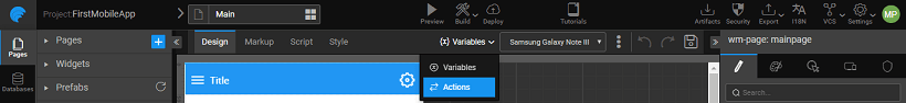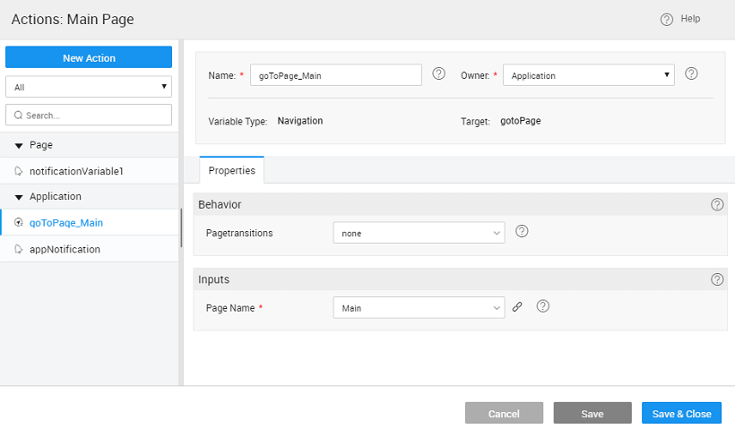 Navigation in the application happens using a Navigation Action. Whenever a page is created a corresponding gotoPage navigation action is generated or you can create a call to action from the Actions Dialog. Actions Dialog can be accessed by selection Actions from Variables Workspace Toolbar.