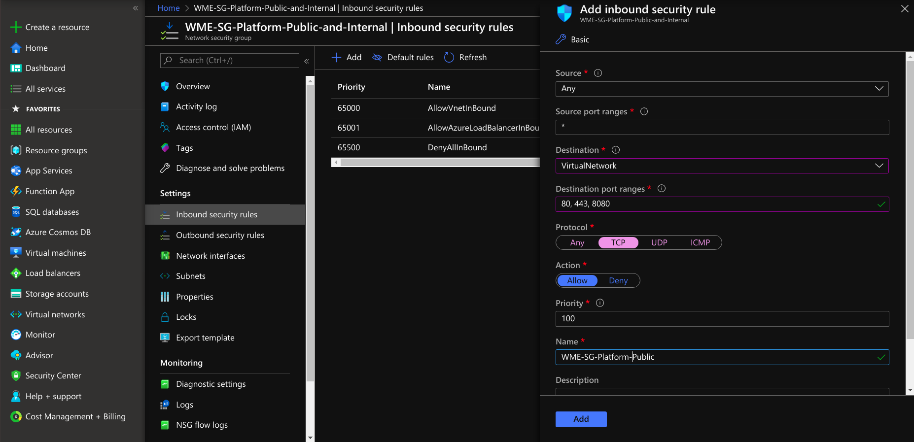 • After creating the network security group under settings, select inbound security rules, create a rule for developer network access and select protocol TCP and add a rule to a network security group.