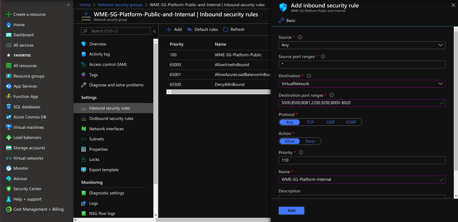 • Create a security rule to open additional ports to access the Platform Virtual Machine and select a destination. Note that restrictions apply to Virtual machines based on the destination selection.