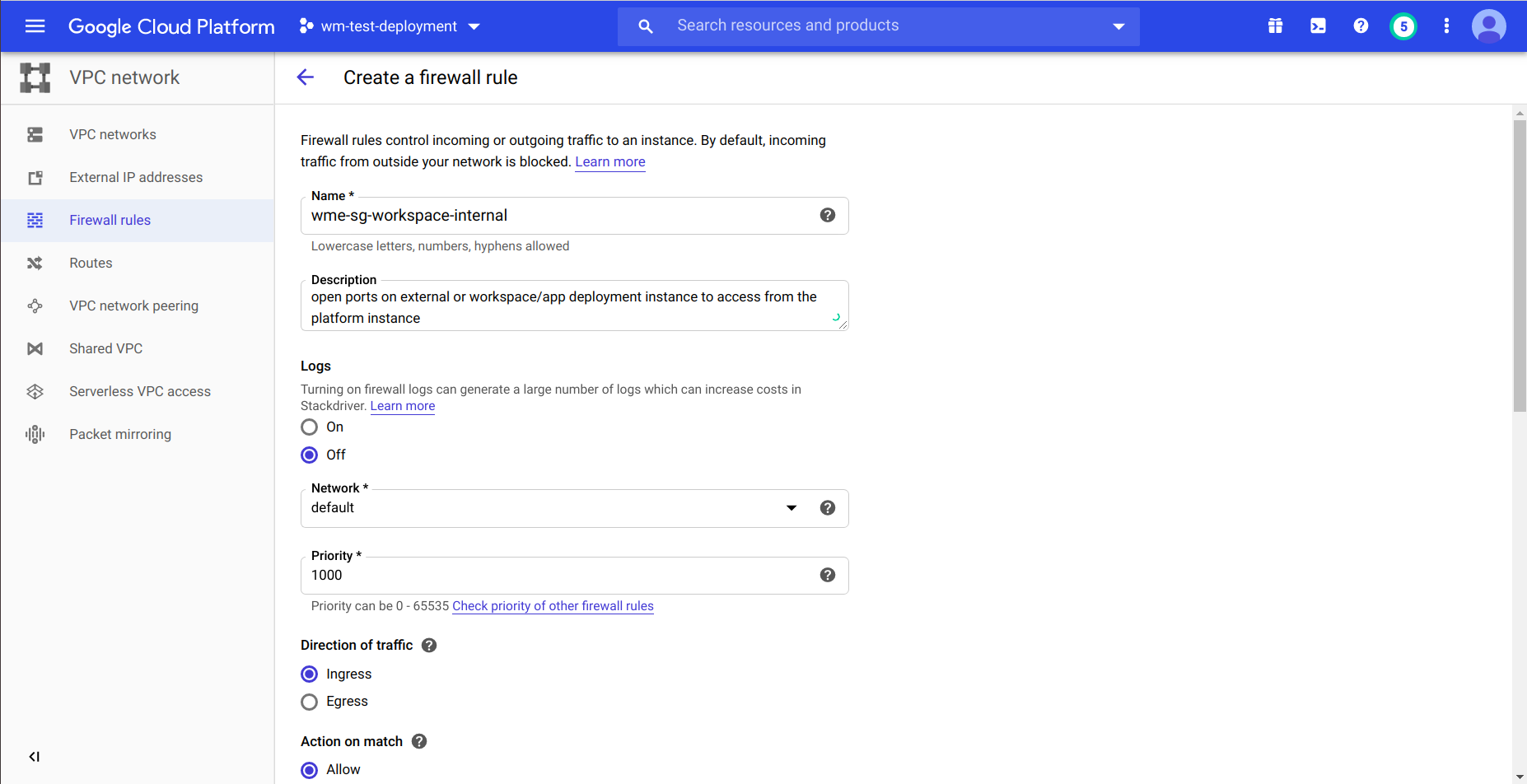 • Select target type and source filter type. by using the target we can connect the firewall rule to Instance. example the which Instance have target tag the firewall is connect to that Instance and by using the source we can open ports to specific Instance. example the which Instance have a source tag the ports will be open to that Instance.we provide this tags at network section during the Instance creation.or else you can select your own Target and Source methods.