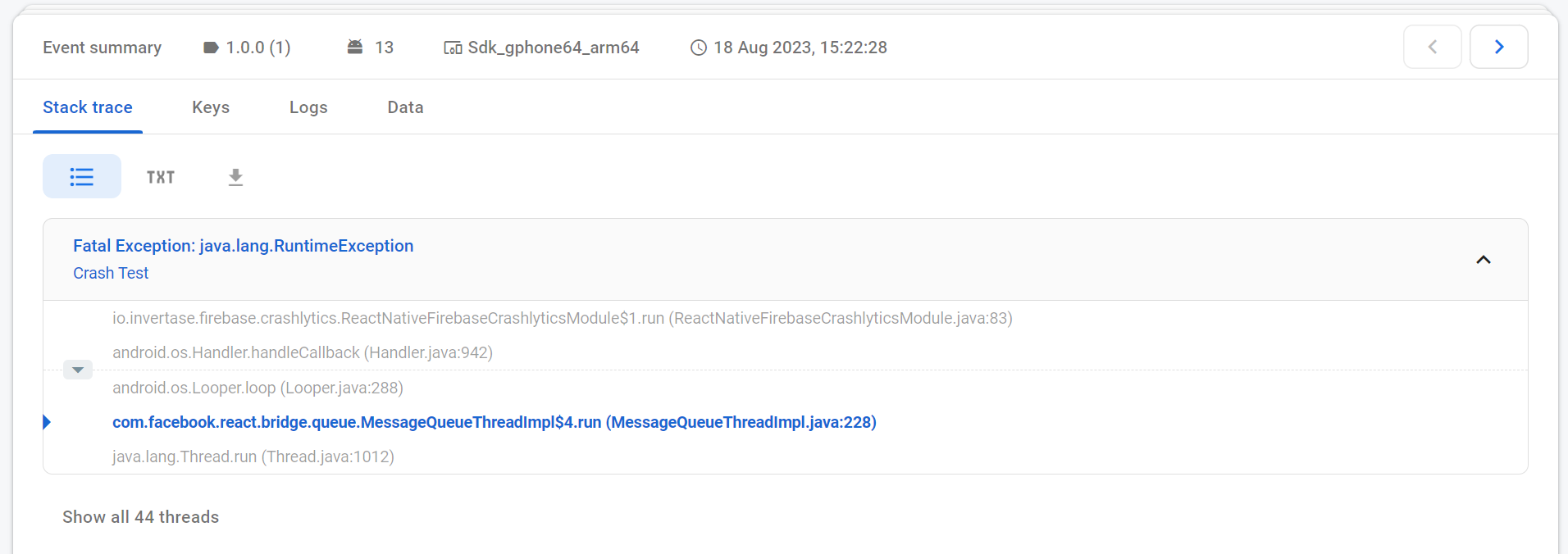 • The dashboard will show a list of recent crashes, with information such as the number of affected users, the issue's impact, and a brief description of the error.