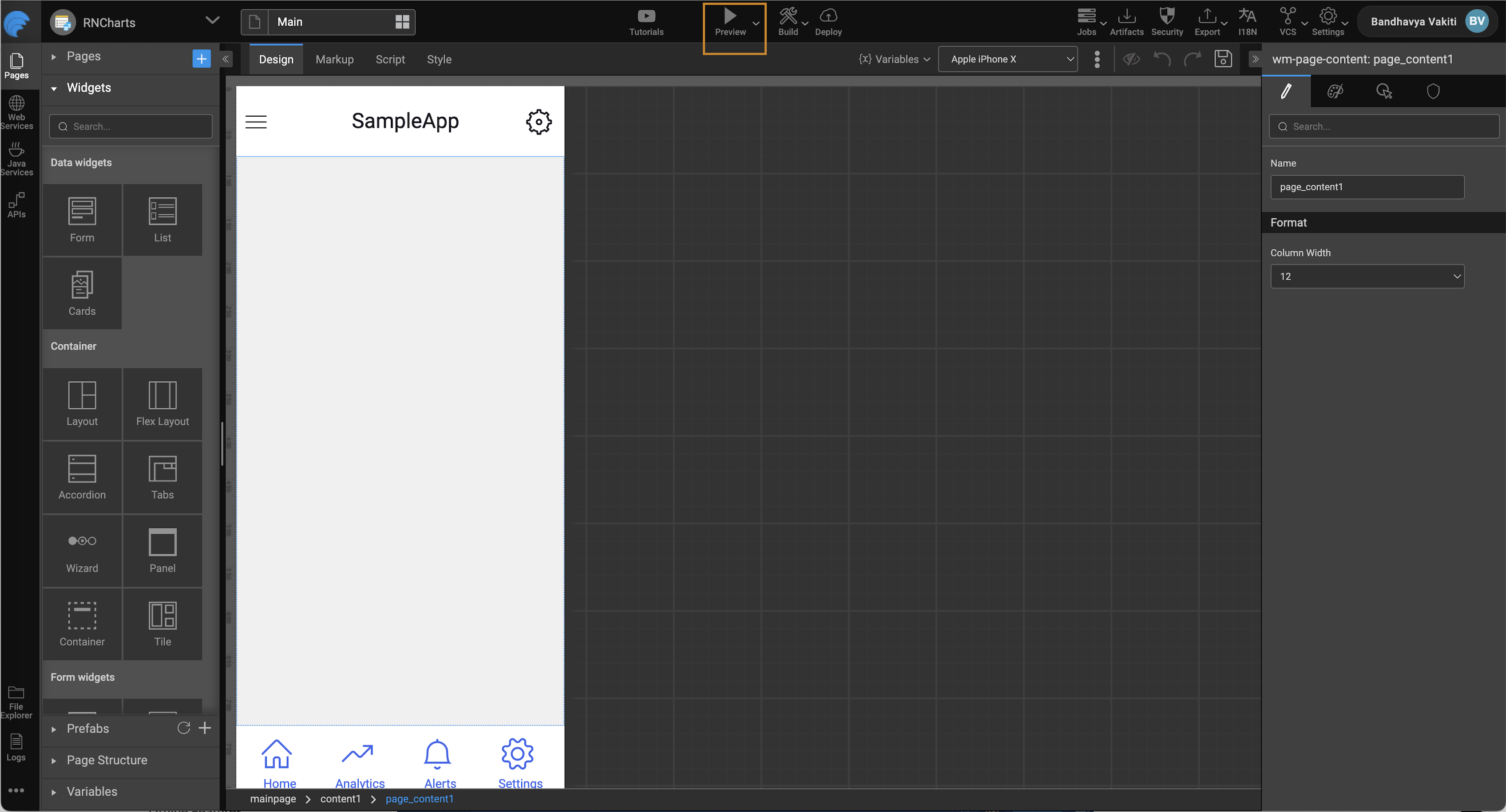 - An application preview displays, where one can select the target device to run the app. This action previews the app on various devices, including different phone sizes.
