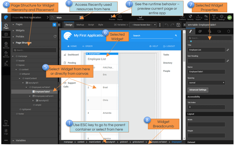 - Widget hierarchy shows the widget construct and allows you to traverse to the parent container.